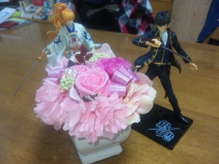 そして夕食後、一人暮らしで私に銀魂を読ませてくれた素晴らしいマイブラザーから母の日のプリザーブドフラワーが届いたので観賞していると、近くに置いてた土方フィギュアがまるで花に斬りかかろうとしているアホな構図ができておりました。